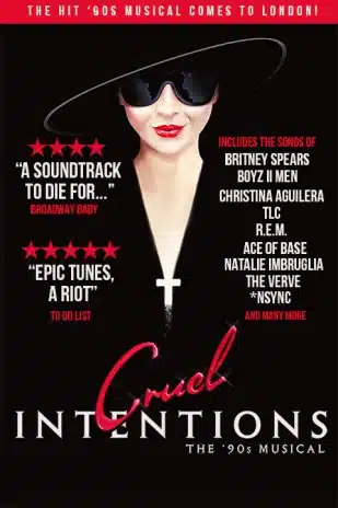 From the producers of smash-hit Heathers the Musical…A must-see experience in New York and Los Angeles and following a sold-out, critically-acclaimed production in the Assembly Palais du Variété spiegeltent at the 2019 Edinburgh Festival Fringe, Cruel Intentions: The ’90s Musical, finally hits London.Manipulative step-siblings Sebastian and Kathryn, flushed with their own sexual prowess, engage in a cruel bet: Kathryn goads Sebastian into attempting to seduce Annette, the headmaster’s virtuous daughter.Weaving a web of secrets and temptation, as the two set out to destroy an innocent girl — and anyone who gets in their way — they wreak havoc at their exclusive Manhattan high school, becoming entangled in their own web of deception and unexpected romance with explosive results…On the 25th anniversary of the hit film Cruel Intentions starring Reese Witherspoon, Ryan Phillippe, Sarah Michelle Gellar and Selma Blair and inspired by Les Liaisons Dangereuses, Cruel Intentions: The ‘90s Musical is a wild jukebox throwback laced with a soundtrack of the greatest ‘90s pop classics including The Verve ‘Bittersweet Symphony’, R.E.M. ‘Losing My Religion’, Natalie Imbruglia ‘Torn’, Ace of Base ‘I Saw the Sign’, Christina Aguilera ‘Genie in a Bottle’, TLC ‘No Scrubs’, Boyz II Men ‘I’ll Make Love to You’, *NSYNC ‘Bye Bye Bye’, Britney Spears ’Sometimes’ and many more.