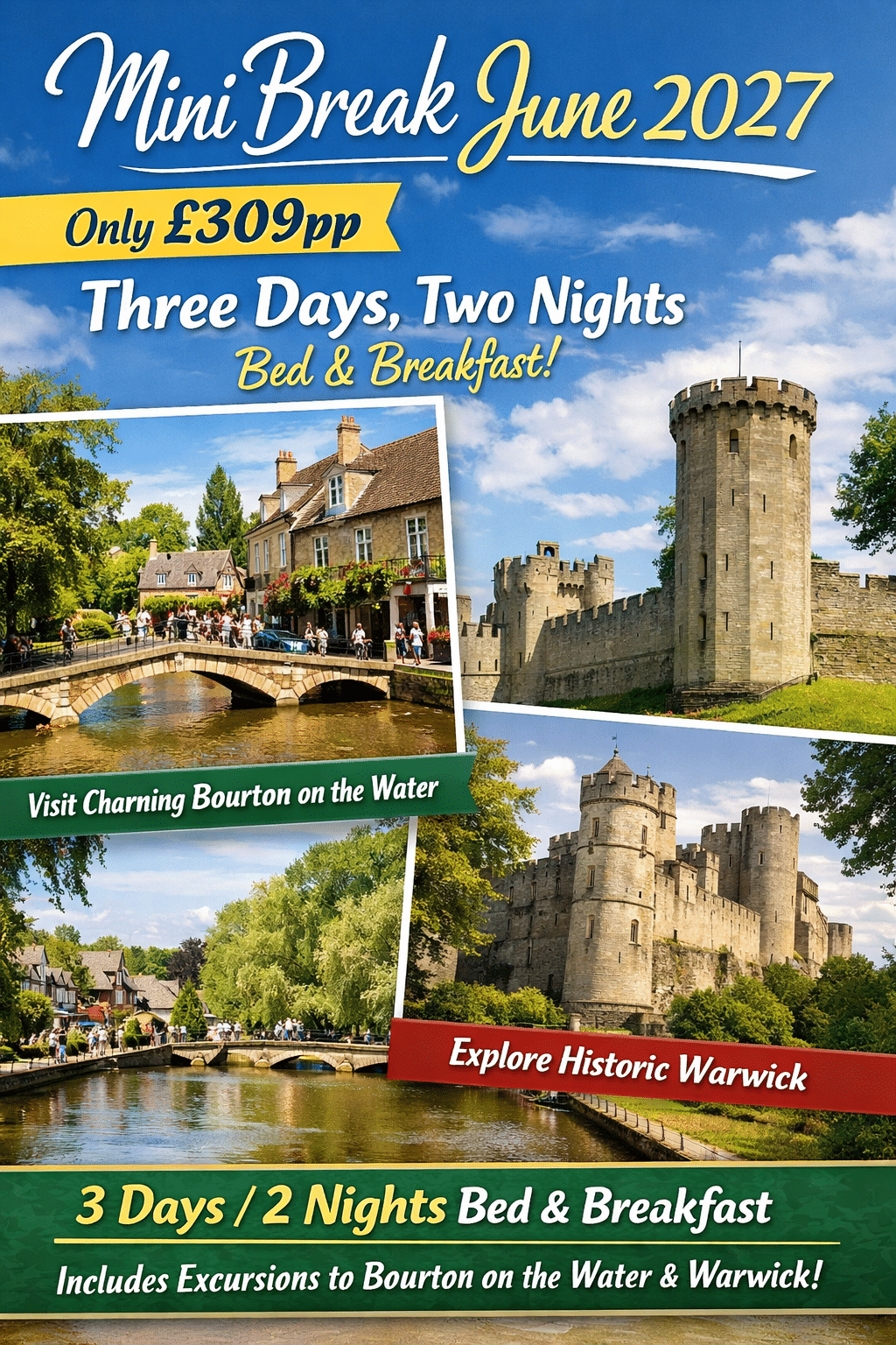 A 3-day / 2-night escorted coach trip staying in the heart of Stratford-upon-Avon, close to the river, theatres, restaurants, and shops.